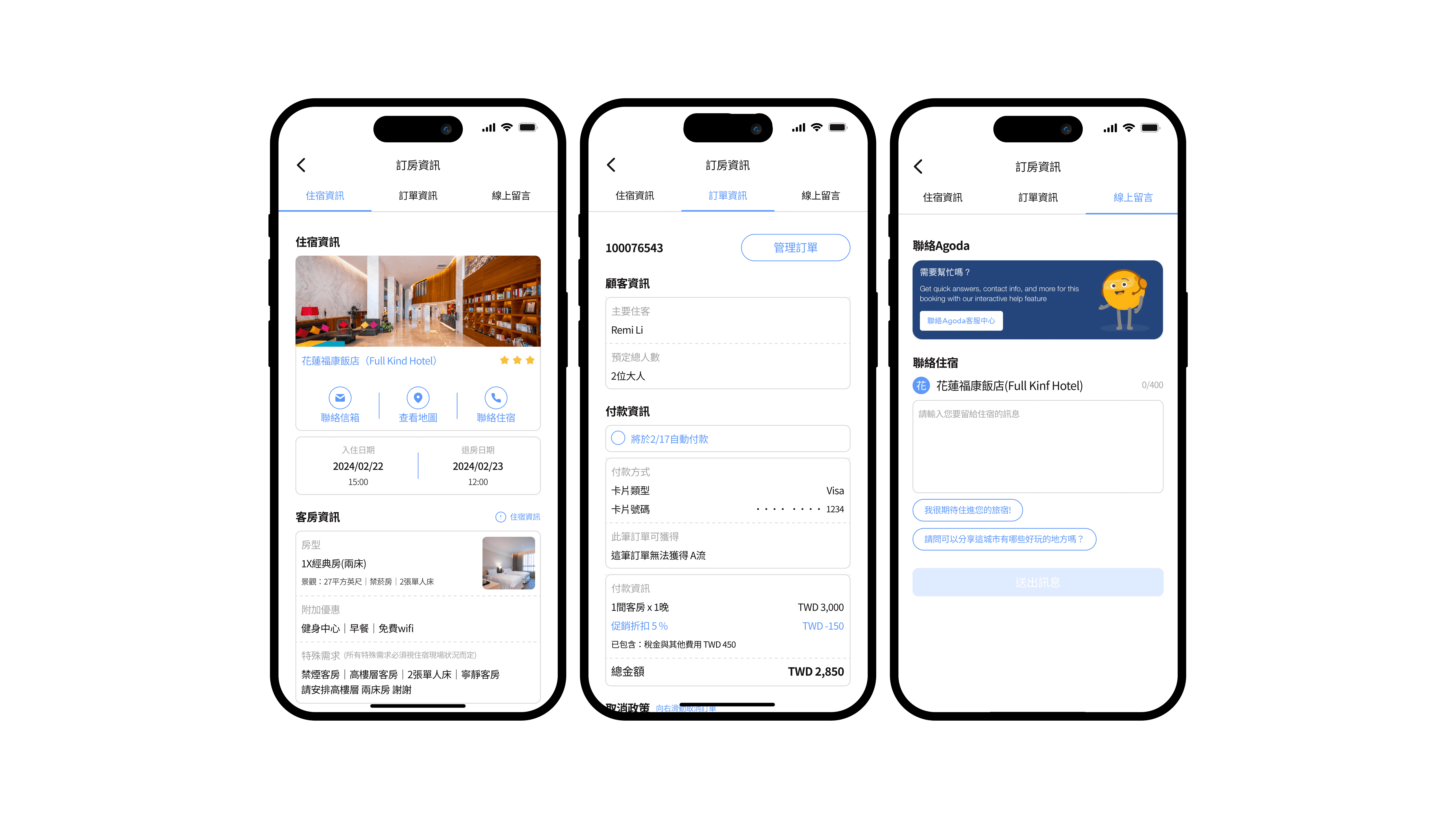3個分頁 住宿資訊 | 訂單資訊 | 線上留言