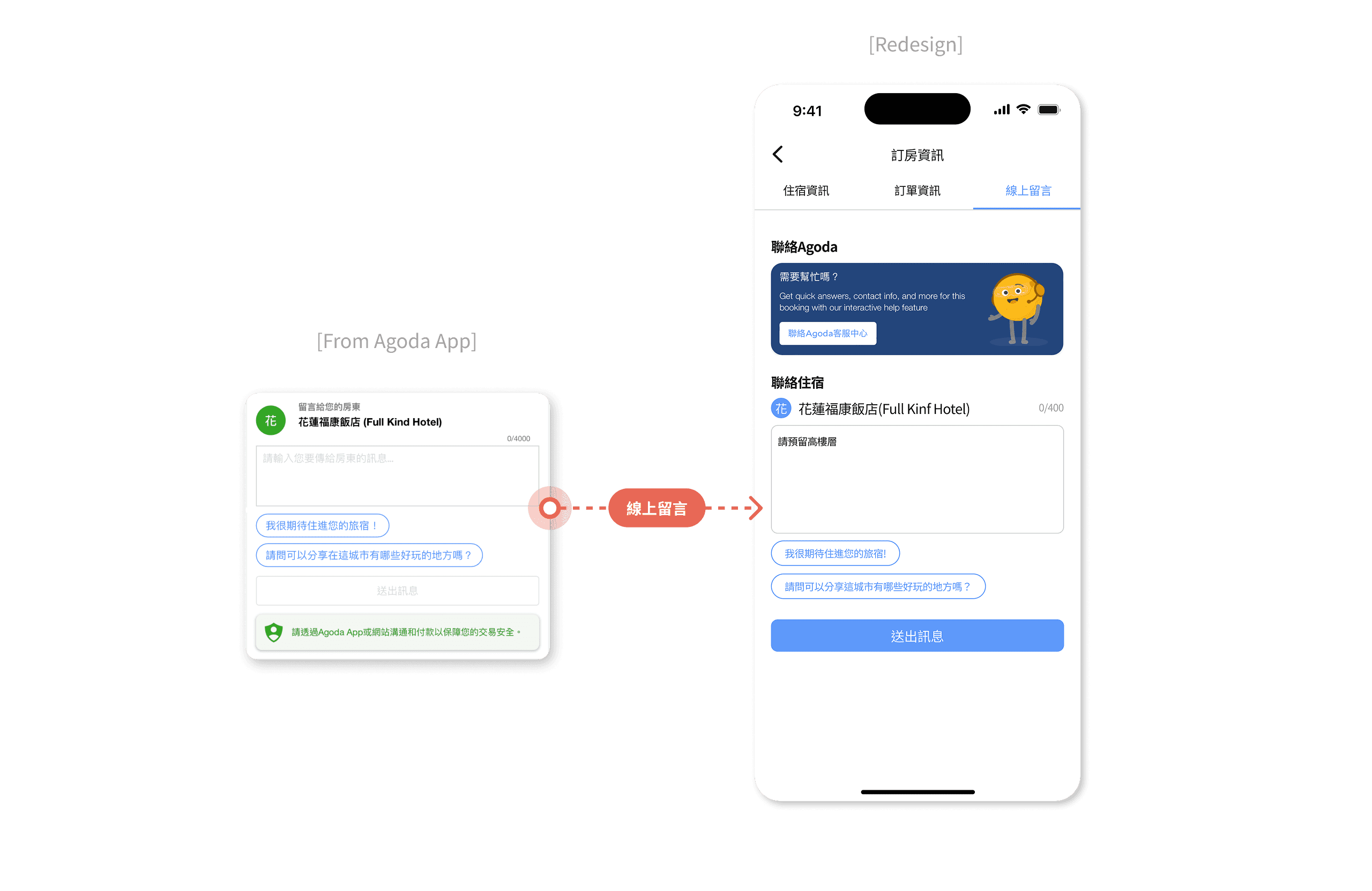 將『線上留言』和『聯絡Agoda客服中心』同樣性質整合在同一個分頁